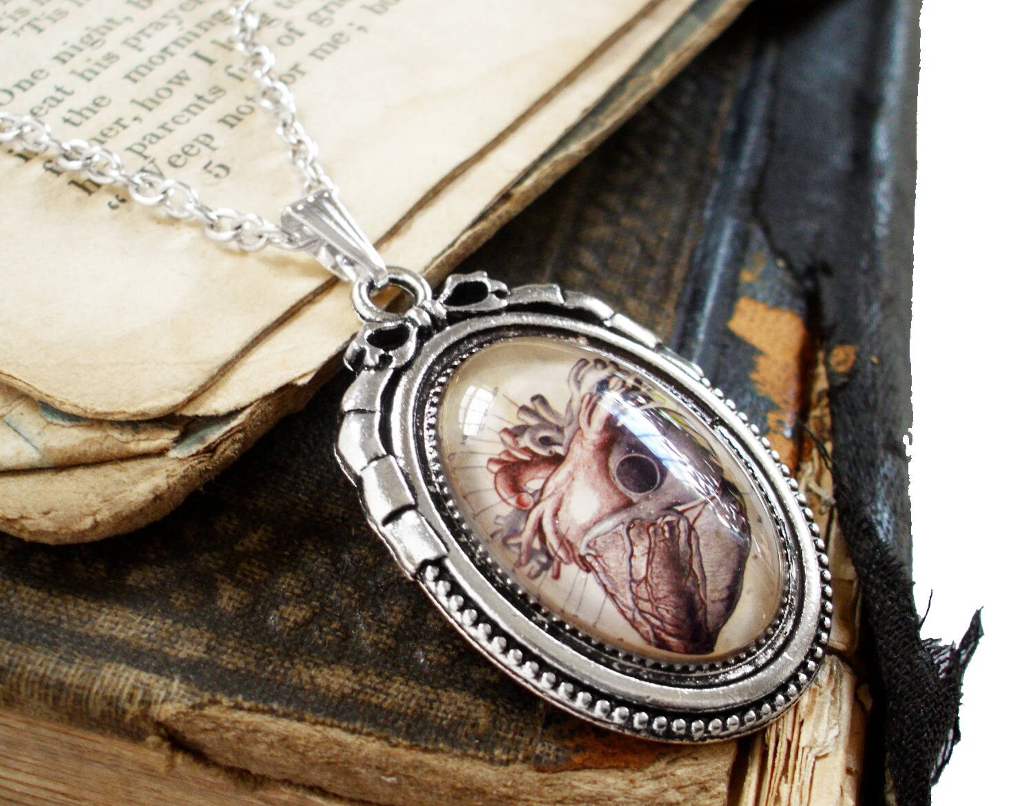 Anatomical Heart Necklace - Antique Anatomy Print Pendant w/ Chain in Silver Finish or Bronze - Oddities