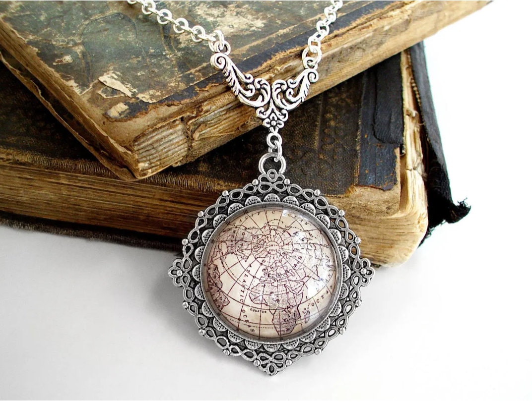 Perfect for the traveler in your life, this beautiful and big pendant measures 45mm round and features the 30mm antique print of the northern hemisphere under a pretty glass dome. No adventurer should be without one!